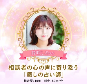 優しい語り口が魅力で、【癒し系占い師】として高く評価されています。話を聞いてもらうだけで心が軽くなると評判で、人の想いを感じ取ることを得意としています。